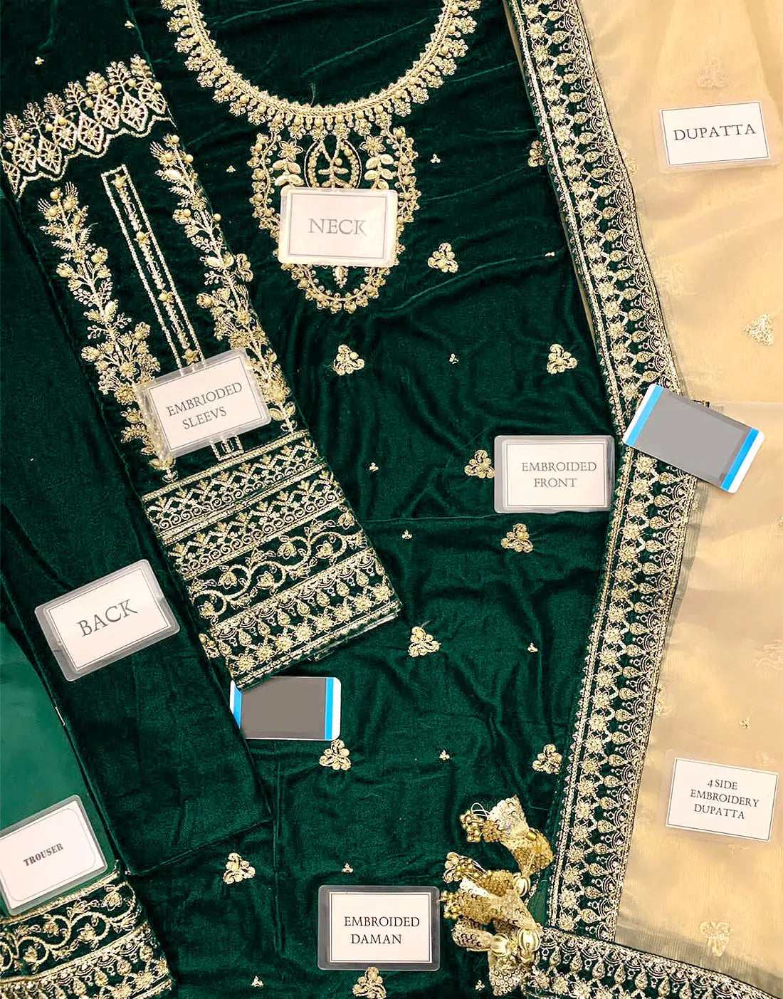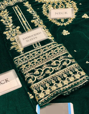 Finding the perfect wedding or party outfit can be overwhelming, especially when ordinary fancy dresses fail to deliver both elegance and comfort. This Luxe Embroidered Bottle Green Velvet Dress solves that problem by combining premium velvet fabric with exquisite hand embroidery, making it a true masterpiece of Pakistani fashion. The deep bottle green shade reflects sophistication, while the delicate embellishments highlight traditional craftsmanship with a modern touch.