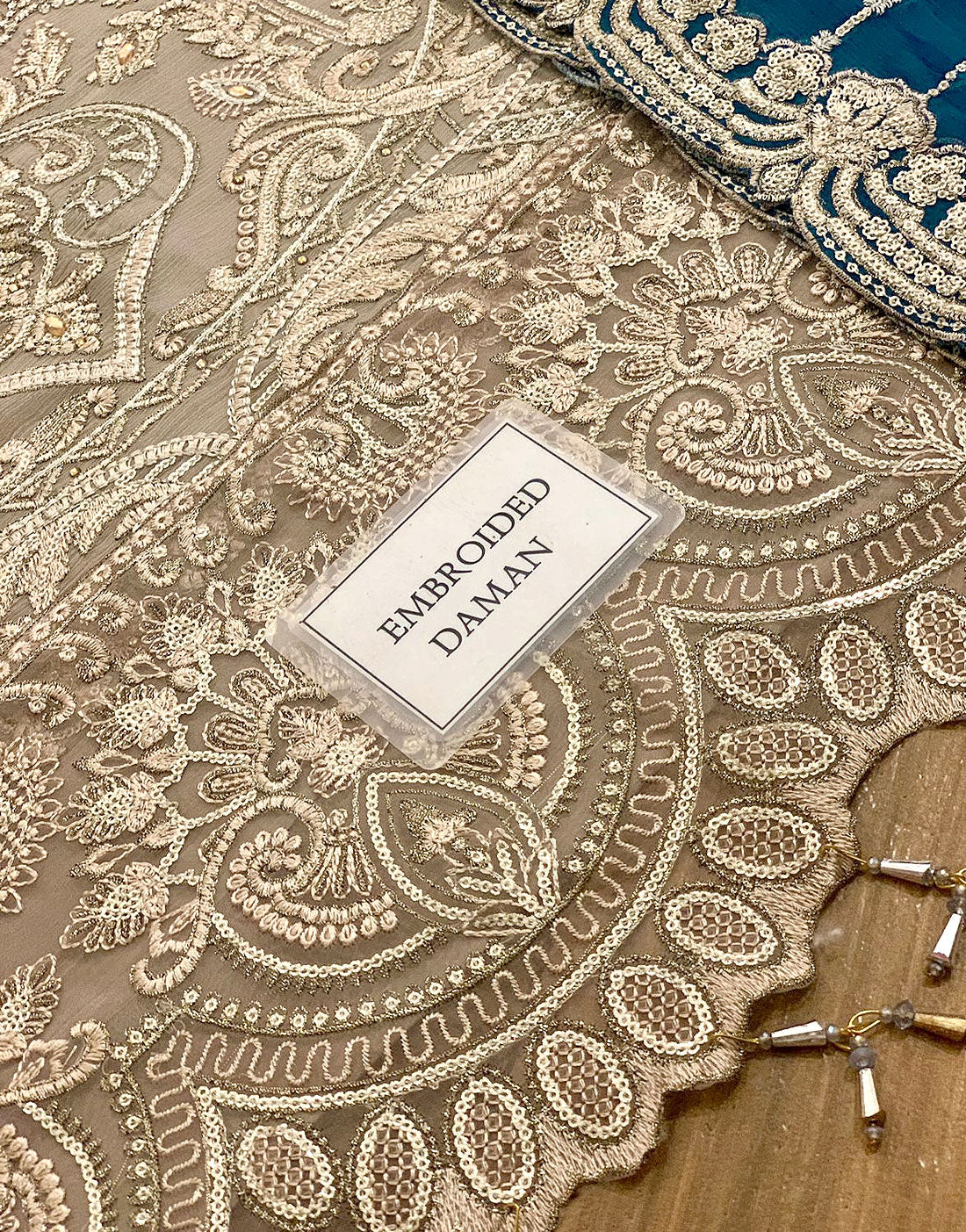 Elevate your festive style with this Luxe Heavy Embroidered Chiffon Party Wear Dress, a perfect blend of elegance and sophistication. Made from premium chiffon fabric, this unstitched outfit features intricate alternate embroidery with zari, thread, and spangle work that adds a luxurious shimmer. The embroidered round neck and full embroidered front enhance its graceful appeal, while the embroidered daman with hanging tassels adds a touch of charm. It comes with embroidered full sleeves with patches, a plain chiffon back, and a 4-side border embroidered chiffon dupatta, making it ideal for formal, party, and wedding occasions in all seasons.