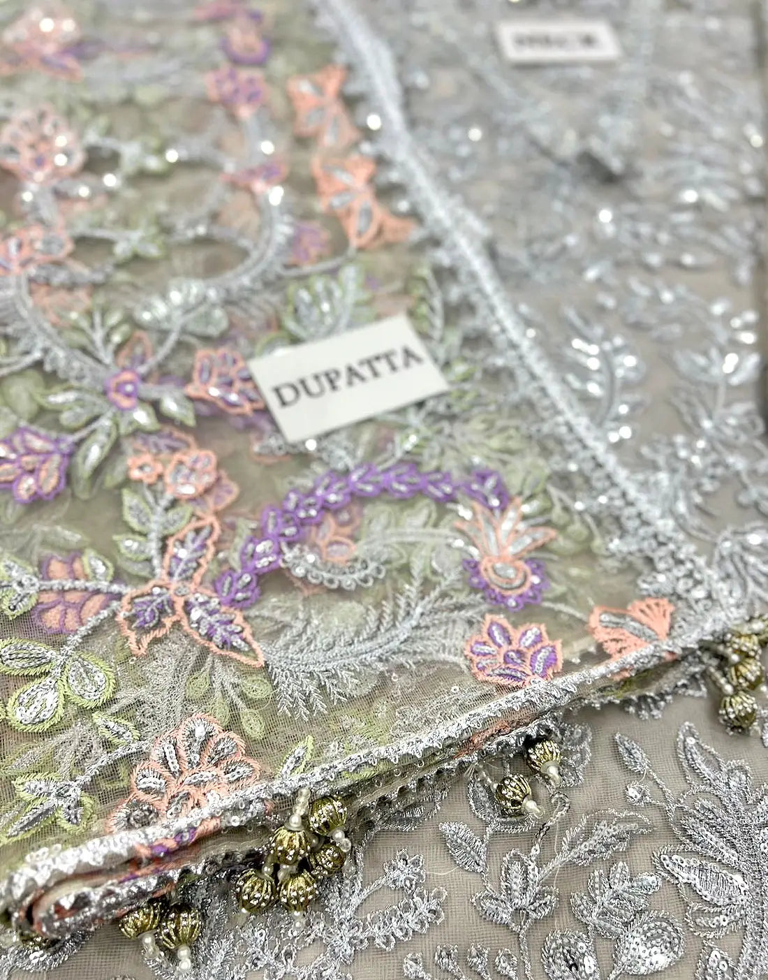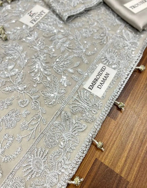 Luxury Embroidered Grey NET Dress for Weddings & Formal Parties