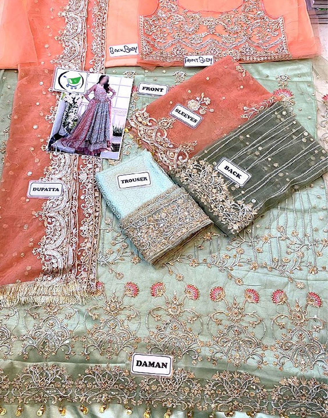 The net maxi has a fabric width of 50 inches for the front and the back. Zari and thread style embroideries are some of the embroidery patterns that are gorgeously used to decorate this ensemble. The addition of sequins, pearls, and nags make this outfit even more mesmerizing. The heavily embroidered peach-hued net dupatta has a kiran lace on its two sides. For the bottoms, you get greyish green trouser with an embroidered patch to design them stylishly according to your preference.