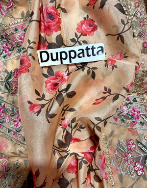 - Dupatta: 4 Side Border Embroidered Printed Silk Dupatta