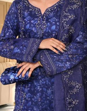 Haleema Semi-Stitched Premium Embroidered Blue Organza Party Dress with Matching Cutch Bag