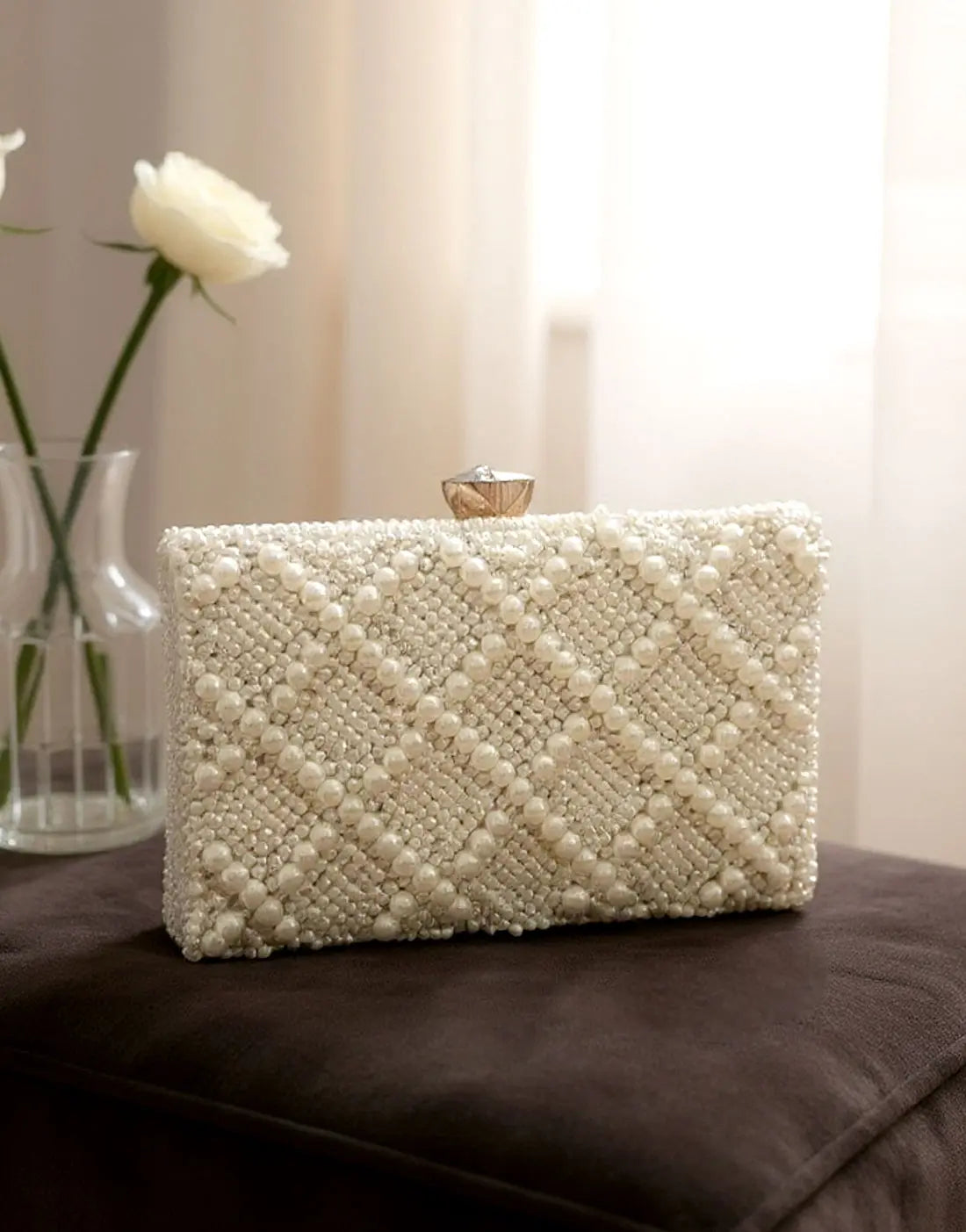 Stylish White Beaded Clutch Bag – Geometric Design for Weddings & Party Wear